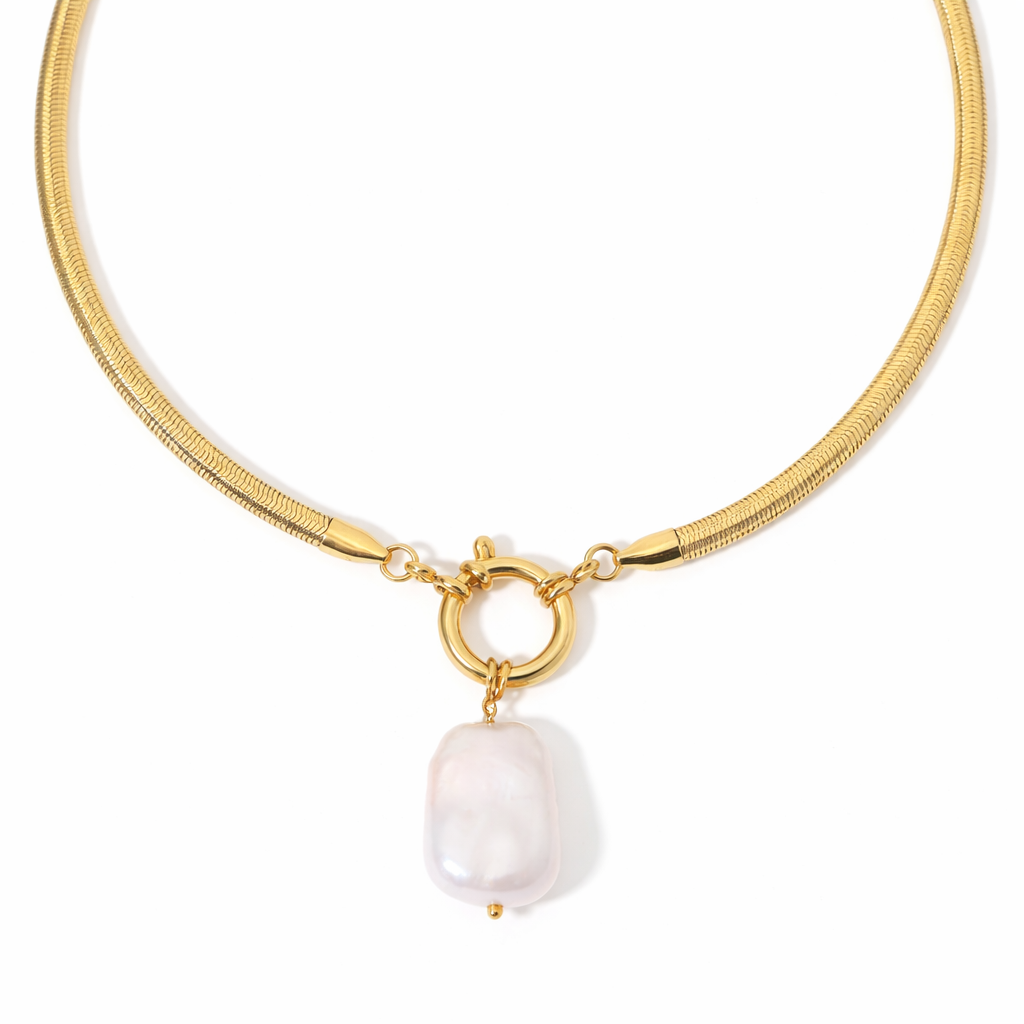 This gorgeous piece features a thick snake chain and a large pearl pendant, adding a touch of beachy sophistication to any look!